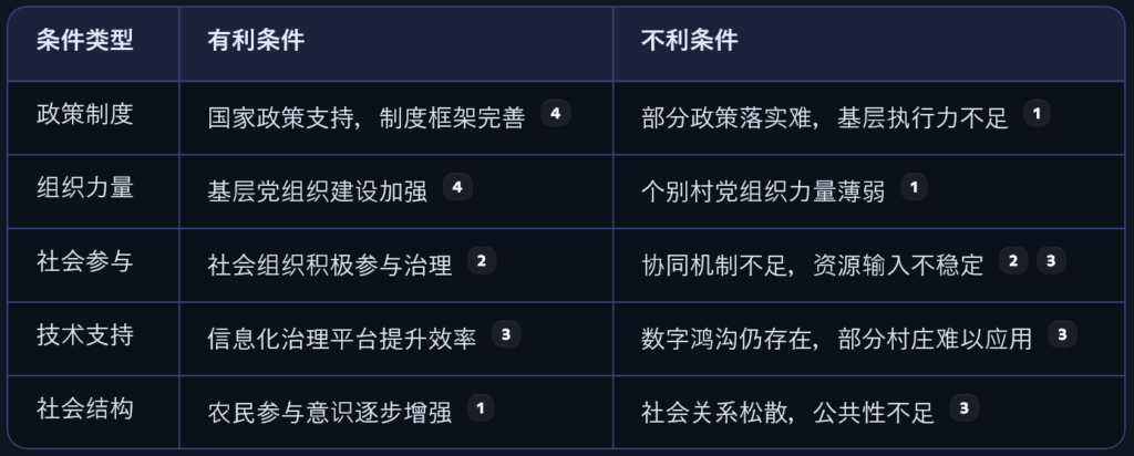 当前(2025年左右)中国农村社会治理的外在条件,既有显著的有利条件,也存在一些结构性不利条件。以下从宏观政策、经济、社会、技术、人口等多个维度进行系统分析: