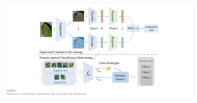 Our algorithm is divided into two phases: supervised contrastive learning and meta-learning. In the first phase, we use a supervised contrastive learning algorithm to train an encoder with strong generalization capabilities using a large number of samples. In the second phase, we treat this encoder as an extractor of plant disease features and adopt the meta-learning training mechanism to accomplish the few-shot disease recognition tasks by training a nearest-centroid classifier based on distance metrics.