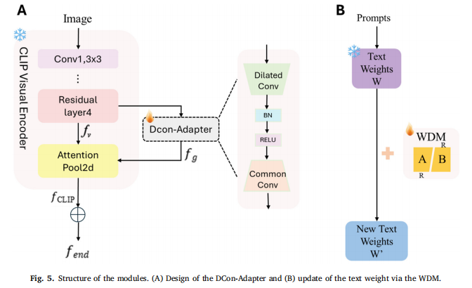 这就是“残差连接” (residual connections) 的核心思想:确保在适应新任务(学习新知识 fg)时,不会丢失基础模型中宝贵的“先验知识” (fCLIP) 。这种“新旧融合”的方式,让模型既能适应农业病害这个特定领域,又保留了 CLIP 模型本身强大的泛化能力。我们已经清楚 DCon-Adapter 是如何强化“图像特征”的了。