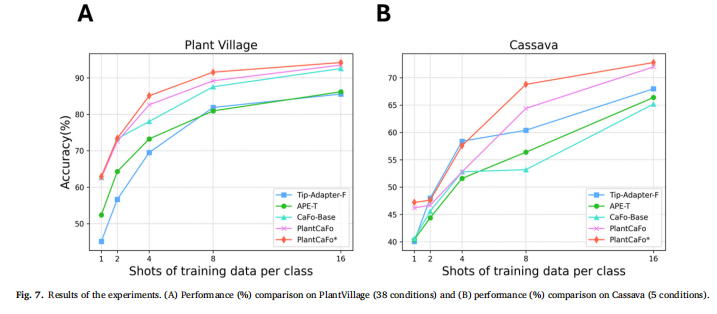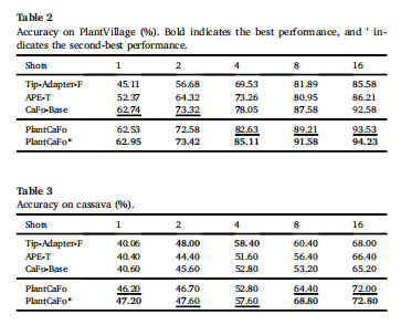 However, there are certain limitations to our approach. While PlantCaFo demonstrates strong performance in controlled environments, its ability to generalize to highly diverse and complex agricultural scenarios may be limited because of the inherent challenges in handling variations in plant disease appearance and image quality. The use of the DCon-Adapter, while improving the feature extraction process, still faces difficulties in capturing all fine-grained disease patterns across different plant species. Additionally, although our approach works effectively on out-of-distribution datasets, the performance gap between different datasets, especially those with complex backgrounds or rare diseases, suggests that further improvements in model robustness are needed.