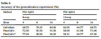 现在请看表 6,在 split1(番茄)上,我们的 PlantCaFo 和 PlantCaFo* 与基线模型 (CaFo-Base) 相比,表现如何?