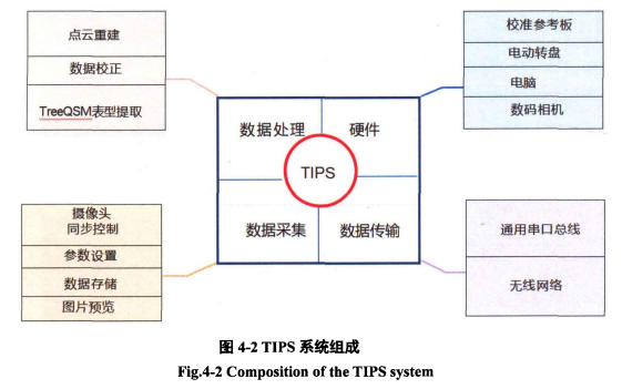 - 为了实现精准的三维测量,作者设计了一套自动化的图像采集设备。请你查看论文的 图4-2 和 图4-3,并结合文字描述,说一说这个TIPS系统的硬件主要由哪几个部分组成?它是如何采集一株雄穗的图像的?