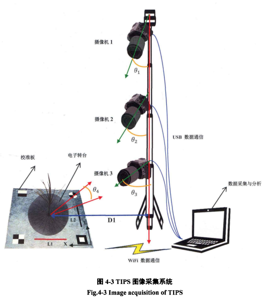 - TIPS由校准参考板、电动转盘、一台电脑和三台数码相机组成,用三台摄像机设定固定的角度和高度来拍摄旋转到固定位置的雄穗的图像。