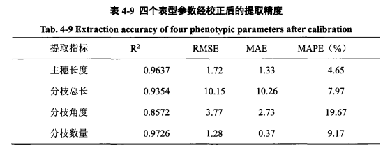 理解了方法之后,我们最关心的就是它的准确性。请你查看论文的 表4-9,看看作者用TIPS系统和TreeQSM算法提取出的“主穗长度”和“分枝数量”,与人工测量的真实值相比,它们的决定系数(R²)分别达到了多少?
