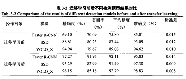 - 这个方法的效果非常显著。请你看一下论文中的 表3-2(上面),对比一下 YOLO_X 模型在使用“迁移学习”前后的“平均精度(%)”和“准确度(%)”有什么变化?