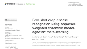 Diseases pose significant threats to crop production, leading to substantial yield reductions and jeopardizing global food security. Timely and accurate detection of crop diseases is essential for ensuring sustainable agricultural development and effective crop management. While deep learning-based computer vision techniques have emerged as powerful tools for crop disease recognition, these methods are heavily reliant on large datasets, which are often difficult to obtain in practical agricultural settings. This challenge highlights the need for models capable of learning from limited data, a scenario known as the few-shot learning problem. In this paper, we introduce a novel few-shot learning approach, the Sequence-Weighted Ensemble Model-Agnostic Meta-Learning (SWE-MAML), designed to train crop disease recognition models with minimal sample sizes. The SWE-MAML framework employs meta-learning to sequentially train a set of base learners, followed by a weighted sum of their predictions for classifying plant disease images. This method integrates ensemble learning with Model-Agnostic Meta-Learning (MAML), allowing the effective training of multiple classifiers within the MAML framework. Experimental results show that SWE-MAML demonstrates strong competitiveness compared to state-of-the-art algorithms on the PlantVillage dataset. Compared to the original MAML, SWE-MAML improves accuracy by 3.75%–8.59%. Furthermore, we observe that the number of base learners significantly influences model performance, with an optimal range of 5–7 learners. Additionally, pre-training with a larger number of disease classes enhances the model’s ability to recognize “unseen” classes. SWE-MAML was also applied to a real-world few-shot potato disease recognition task, achieving an accuracy of 75.71% using just 30 images per disease class in the support set. These findings validate that SWE-MAML is a highly effective solution for the few-shot recognition of crop diseases, offering a promising approach for practical deployment in agricultural settings where data scarcity is a major challenge. The integration of ensemble learning with meta-learning enables high-performance disease recognition with minimal data, marking a significant advancement in the field.