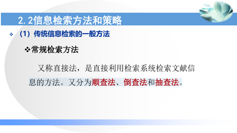 9.常规检索方法又称直接法,是直接利用检索系统检索文献信息的方法;又分为(顺查法)、(倒查法)和(抽查法)。