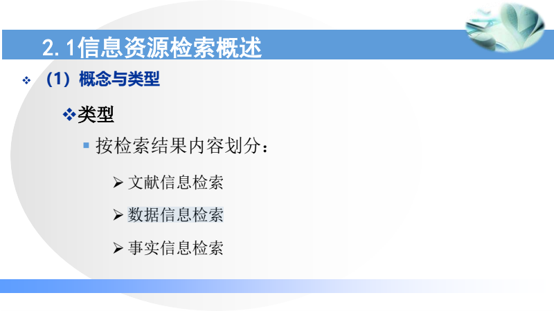 2.按检索结果内容划分,信息资源检索可以分为:(文献)信息检索、(数据)信息检索和(事实)信息检索。