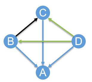 6下图中的A,B,C,D表示4个网页,箭头表示页面间的链接关系,比如B--->C,表示存在从页面B到页面C的一条出链,若PR_A, PR_B, PR_C, PR_D分别表示页面A-D的PageRank值,请基于课件中介绍的PageRank算法简单计算原理,给出PR_A的计算公式:PR_A = ( ) + ( ) / 2 + ( ) / 3.