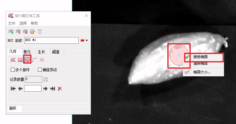 22.在感兴趣区域对话框中选择椭圆,在图像对应位置进行勾画,勾画完成后右键点击“接受椭圆”。如需建立多个感兴趣区域,重复本步骤即可。
